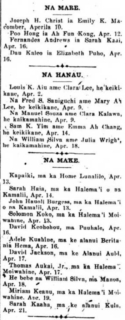 Kapaiki, at Lunalilo Home, Apr. 13.