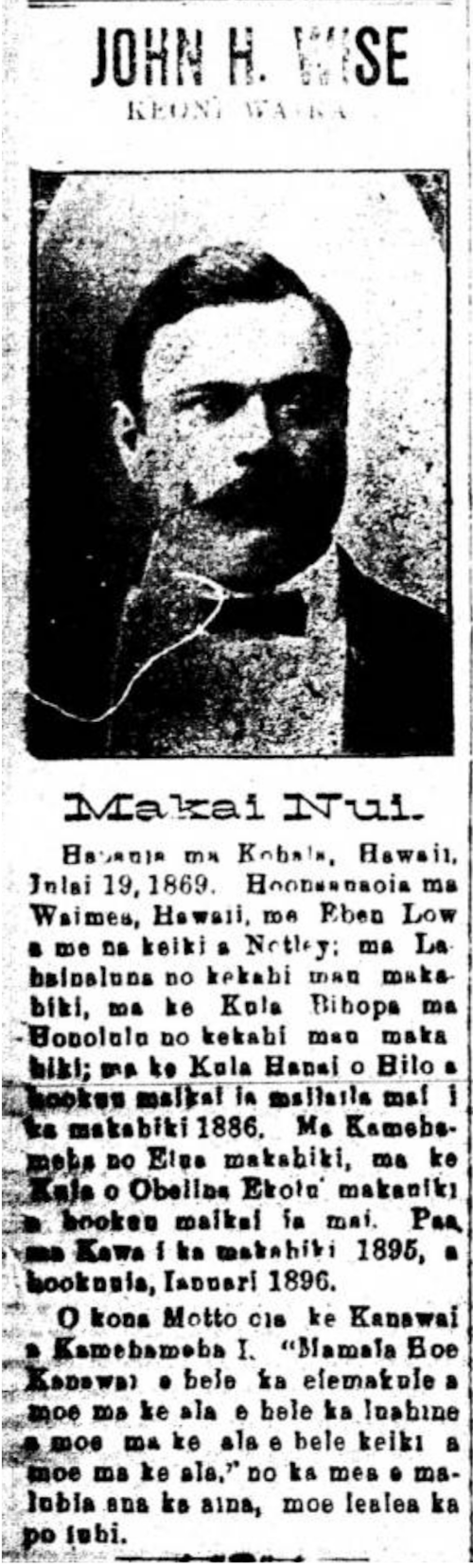 Born in Kohala, Hawaii, July 19, 1869. Educated at Waimea, Hawaii, with Eben Low and the children of Notley; at Lahainaluna for a number of years; at the School of Bishop in Honolulu for some years, at the Boarding School of Hilo and he graduated there in 1886. He was at Kamehameha for two years, and at Oberlin College [Kula o Obelina] for three years and he graduated. He was imprisoned in 1895, and released in 1896.