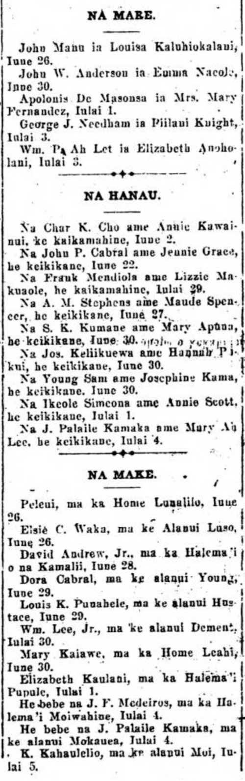 To Joseph Keliikuewa and Hannah Paikui, a son, June 30.