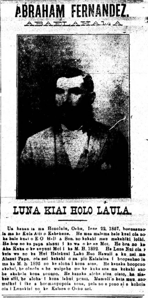 He was born in Honolulu, Oahu, June 22, 1857, educated at the Royal School of Kahehuna. He was a storekeeper for the store of E. O. Hall & Son, for many years. He was a member of the road board during the Monarchy. He was a member of the Privy Council of the Monarchy in the year 1892. He is currently an Executive for the Hawaiian Hardware Company on Fort Street; he is one of the political prisoners imprisoned in 1895 for his patriotism. He is an unpretentious upright man, he is gracious, and gentlemanly, and speaks with careful thought. He is a true patriot, he has affection for the alii, and aloha for his own lahui. Because of this fine nature, it is known and understood that he should be voted for as a Supervisor for the County of Oahu nei.