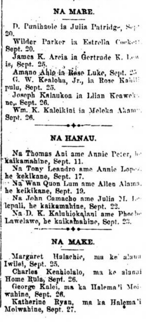 G. W. Kealoha, Jr., to Rose Kahilipulu, Sept. 25.
