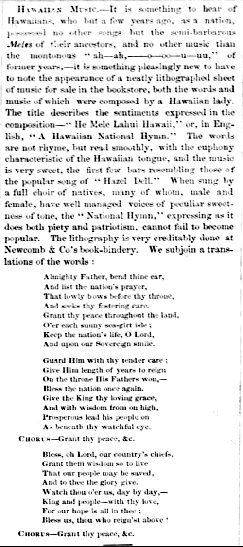 Hawaiian Music.—It is something to hear of Hawaiians, who but a few years ago, as a nation, possessed no other songs but the semi-barbarous Meles of their ancestors, and no other music than the montonous “ah—ah,——o—oo—u—uu,” of former years,—it is something pleasingly new to have to note the appearance of a neatly lithographed sheet of music for sale in the bookstore, both the words and music of which were composed by a Hawaiian lady. The title describes the sentiments expressed in the composition—”He Mele Lahui Hawaii,” or, in English, “A Hawaiian National Hymn.” The words are not rhyme, but read smoothly, with the euphony characteristic of the Hawaiian tongue, and the music is very sweet, the first few bars resembling those of the popular song of “Hazel Dell.” When sung by a full choir of natives, many of whom, male and female, have well managed voices of peculiar sweetness of tone, the “National Hymn,” expressing as it does both piety and patriotism, cannot fail to become popular. The lithography is very creditably done at Newcomb & Co’s book-bindery. We subjoin a translations of the words: