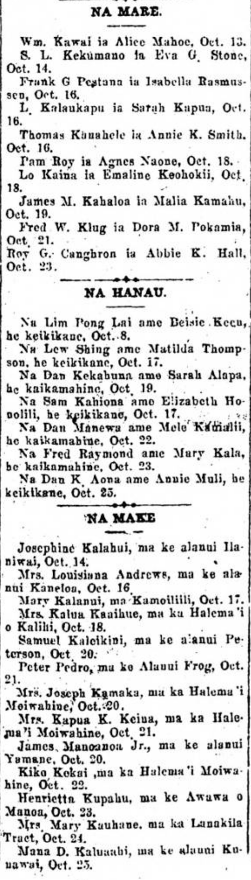 James M. Kahaloa to Malia Kamahu, Oct. 19.