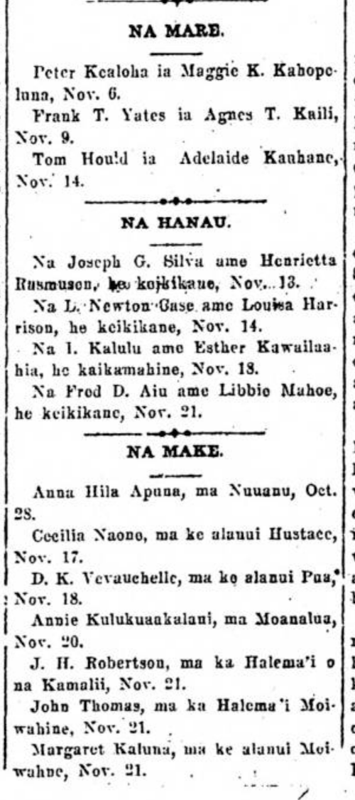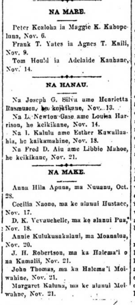 To Fred D. Aiu and Libbie Mahoe, a son, Nov. 21.