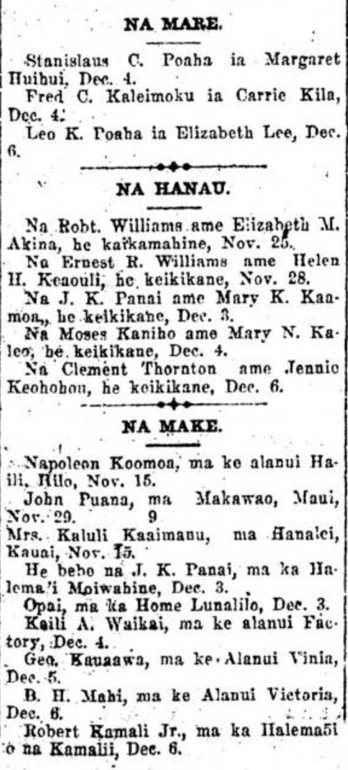 To Moses Kaniho and Mary N. Kaleo, a son, Dec. 4.