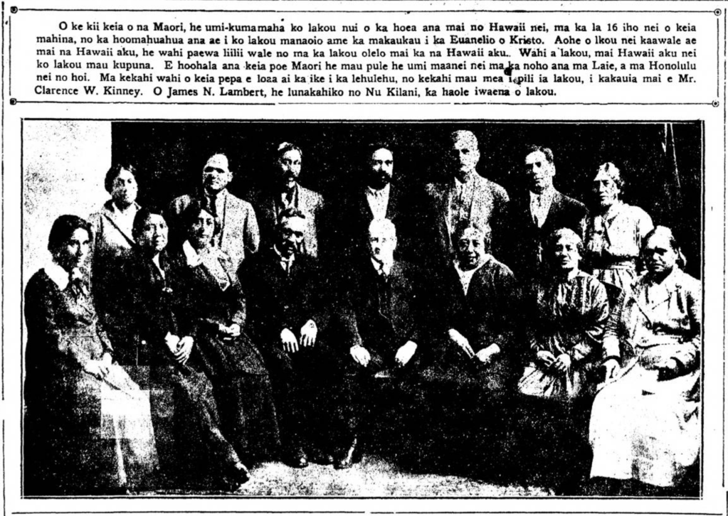 This is a photograph of the Maori, number fourteen, who arrived in Hawaii nei, on the 16th of this month, to increase their faith and their understanding of the Gospel of Christ. They are not separate from Hawaiians, they are just a little different in their language from the Hawaiians. According to them their kupuna came from Hawaii. These Maori will spend ten weeks here, staying at Laie, and here in Honolulu. Located in this paper are many thoughts pertaining to them, written by Mr. Clarence W. Kinney. James Lambert is an elder from New Zealand, the haole amongst them.