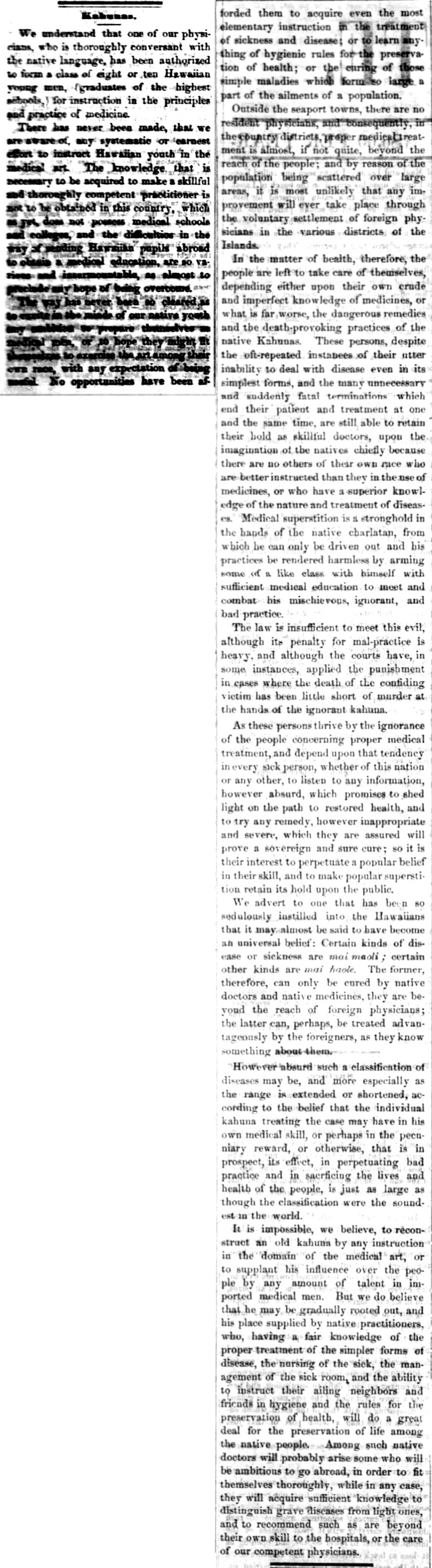 There has never been made, that we are aware of, any systematic or earnest effort to instruct Hawaiian youth in the medical art. The knowledge that is necessary to be acquired to make a skillful and thoroughly competent practitioner is not to be obtained in this country, which as yet, does not possess medical schools and colleges, and the difficulties in the way of sending Hawaiian pupils abroad to obtain a medical education, are so various and insurmountable, as almost to preclude any hope of being overcome.