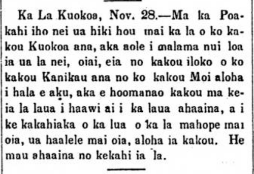 Ka La Kuokoa, Nov. 28.—The day of our Independence came once again this past Monday, but the day was not greatly celebrated, because we are in Mourning for our beloved King who has passed on, but we recall on this day the two of them held their banquet, and then on the morning two days following it, he passed on; aloha for us. There were indeed banquets held on that day.