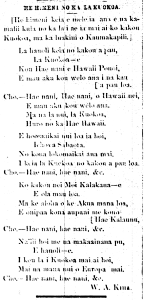 [This is a song that will be sung by the school children at the church of Kaumakapili on that day that our Independence was recognized.]