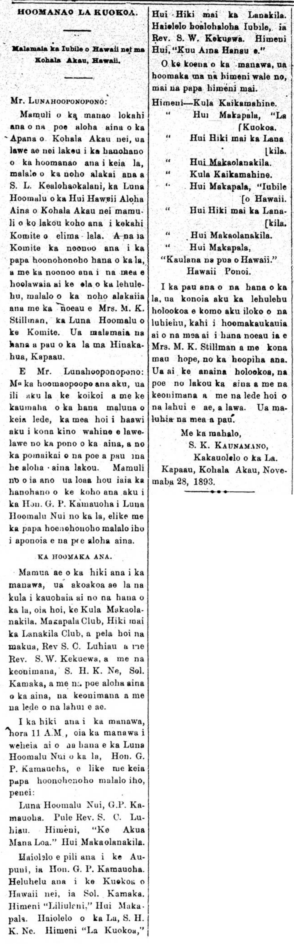 Because of the unity of the patriots of the District here of North Kohala, they carried out the honor of commemorating this day, under the leadership of S. L. Kealohaokalani, the Chairman of the Hawaiian Patriotic League of North Kohala [Hui Hawaii Aloha Aina o Kohala Akau], as a result of they selected a Committee of five members. And it was that Committee which thought of the program of events for the day, and who thought of the things that would give sustenance to the people, under the skilled direction of Mrs. M. K. Stillman [Mary Kaulalani Stillman], the Chairman of the Committee. All the activities of the day were carried out at Hinakahua, Kapaau.