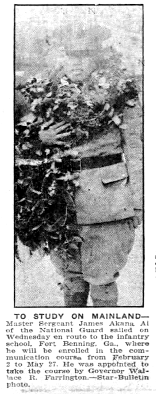 TO STUDY ON MAINLAND—Master Sergeant James Akana Ai of the National Guard sailed on Wednesday en route to the infantry school, Fort Benning, Ga., where he will be enrolled in the communication course from February 2 to May 27. He was appointed to take the course by Governor Wallace R. Farrington.—Star-Bulletin photo.
