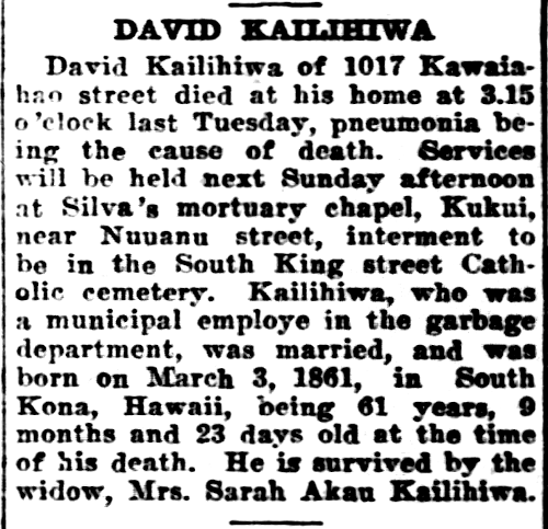 David Kailihiwa of 1017 Kawaiahao street died at his home at 3:15 o’clock last Tuesday, pneumonia being the cause of death. Services will be held next Sunday afternoon at Silva’s mortuary chapel, Kukui, near Nuuanu street, interment to be in the South King street Catholic cemetery.* Kailihiwa, who was a municipal employe in the garbage department, was married, and was born on March 3, 1861, in South Kona, Hawaii, being 61 years, 9 months and 23 days old at the time of his death. He is survived by the widow, Mrs. Sarah Akau Kailihiwa.