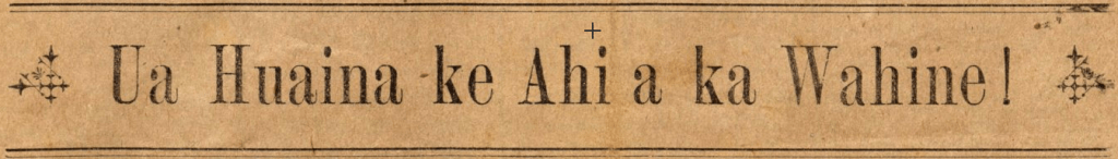 To the Editor of the Kuokoa Newspaper, aloha nui oe:—Please may you be patient in inserting in an open space of the columns of the esteemed newspaper of the lahui so that the many intimates and friends will know, and it shall be the speedy messenger pigeon that carries to all the neighborhoods of our islands, from where the sun arrives at Haehae until where it sets at the base of Lehua, that Mrs. Mileka Paia has passed, the lehua blossom has faded; she sleeps the sleep of summer and winter; the lehua scattering rain of Panaewa will no more sprinkle upon her, the Kanilehua rain will no more mist upon her cheeks, the lehua lei of Olaa will no more adorn her; and following her are mounds of tears being cried for her constantly night and day, while trying to calm the aloha that cannot be calmed, for she is gone, no more will we see her and hear her voice. Auwe, how heart wrenching! Continue reading