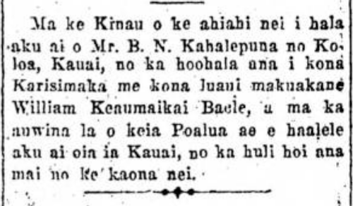 Aboard the Kinau of this past evening, Mr. B. N. Kahalepuna left for Koloa, Kauai, to spend his Christmas with his birth father, William Keaumaikai Bacle, and in the afternoon of this coming Tuesday, he will leave Kauai to come back to town.