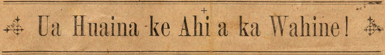 To the Editor of the Kuokoa Newspaper, aloha nui oe:—Please may you be patient in inserting in an open space of the columns of the esteemed newspaper of the lahui so that the many intimates and friends will know, and it shall be the speedy messenger pigeon that carries to all the neighborhoods of our islands, from where the sun arrives at Haehae until where it sets at the base of Lehua, that Mrs. Mileka Paia has passed, the lehua blossom has faded; she sleeps the sleep of summer and winter; the lehua scattering rain of Panaewa will no more sprinkle upon her, the Kanilehua rain will no more mist upon her cheeks, the lehua lei of Olaa will no more adorn her; and following her are mounds of tears being cried for her constantly night and day, while trying to calm the aloha that cannot be calmed, for she is gone, no more will we see her and hear her voice. Auwe, how heart wrenching! Continue reading