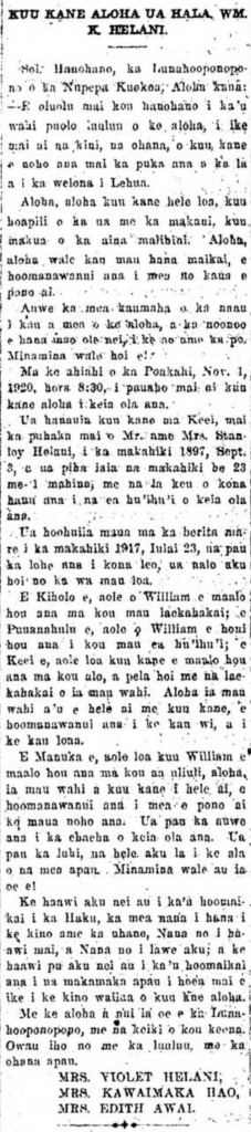 My dear husband was born at Keei, from the loins of Mr. and Mrs. Stanley Helani, in the year 1897, Sept. 3, and he breathed in the cool air of this life for 23 years, 1 month, and some days.
