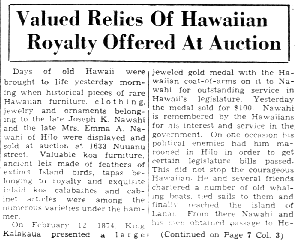 Days of old Hawaii were brought to life yesterday morning when historical pieces of rare Hawaiian furniture, clothing, jewelry and ornaments belonging to the late Joseph K. Nawahi and the late Mrs. Emma A. Nawahi of Hilo were displayed and sold at auction at 1633 Nuuanu street. Valuable koa furniture, ancient leis made of feathers of extinct Island birds, tapas belonging to royalty and exquisite inlaid koa calabashes and cabinet articles were among the numerous varieties under the hammer.