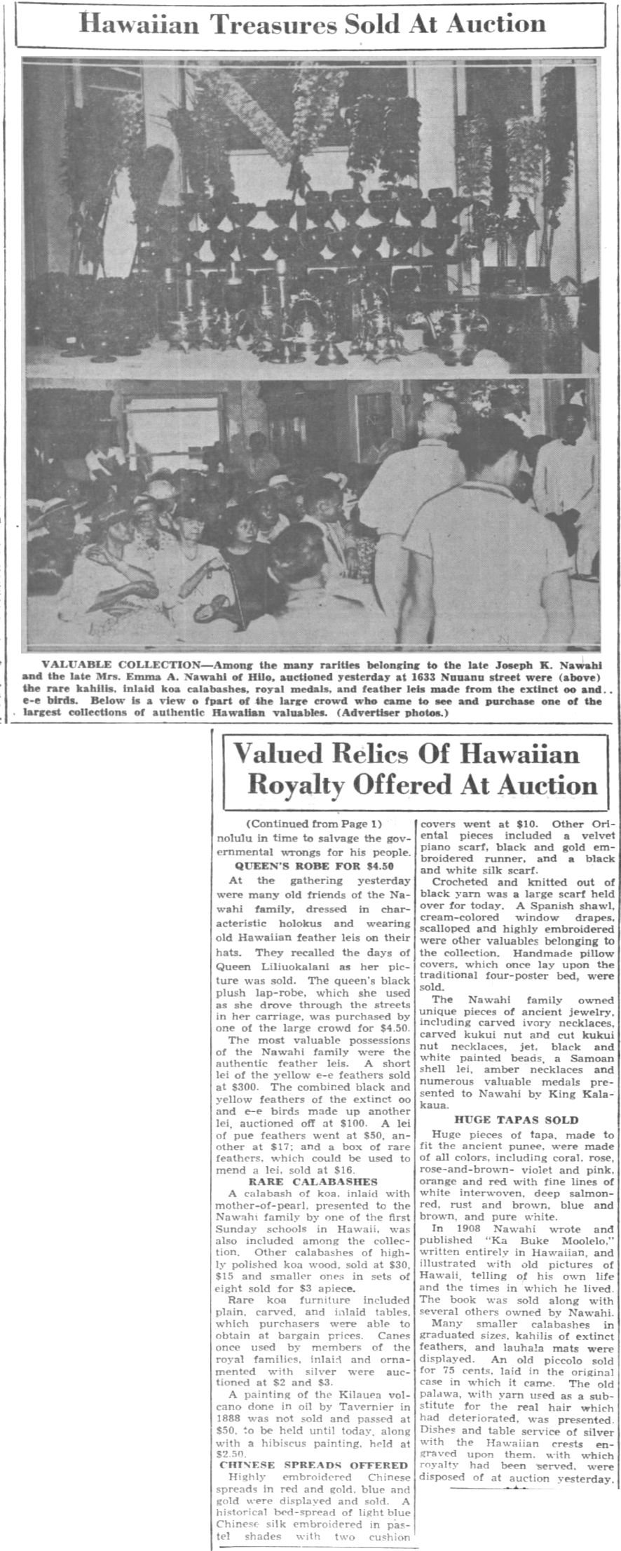 VALUABLE COLLECTION—Among the many rarities belonging to the late Joseph K. Nawahi and the late Mrs. Emma A. Nawahi of Hilo, auctioned yesterday at 1633 Nuuanu street were (above) the rare kahilis, inslaid koa calabashes, royal medals, and feather leis made from the extinct oo and e-e birds. Below is a view of part of the large crowd who came to see and purchase one of the largest collections of authentic Hawaiian valuables. (Advertiser photos.)