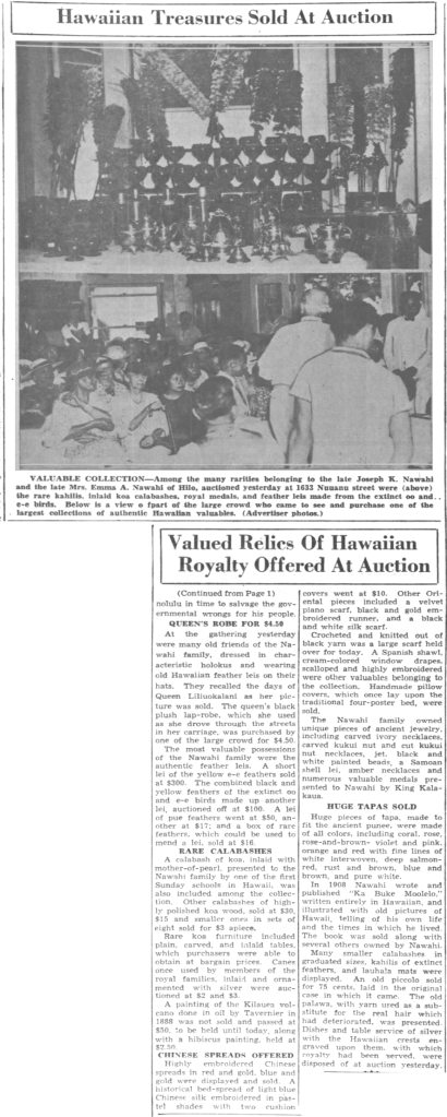 The most valuable possessions of the Nawahi family were the authentic feather leis. A short lei of the yellow e-e feathers sold at $300. The combined black and yellow feathers of the extinct oo and e-e birds made up another lei, auctioned off at $100. A lei of pue feathers went at $50, another at $17; and a box of rare feathers, which could be used to mend a lei, sold at $16.