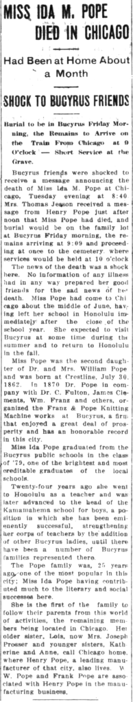 The news of the death was a shock here. No information of any illness had in any way prepared her good friends for the sad news of her death. Miss Pope had come to Chicago about the middle of June, having left her school in Honolulu immediately after the close of the school year. She expected to visit Bucyrus at some time during the summer and to return to Honolulu in the fall.