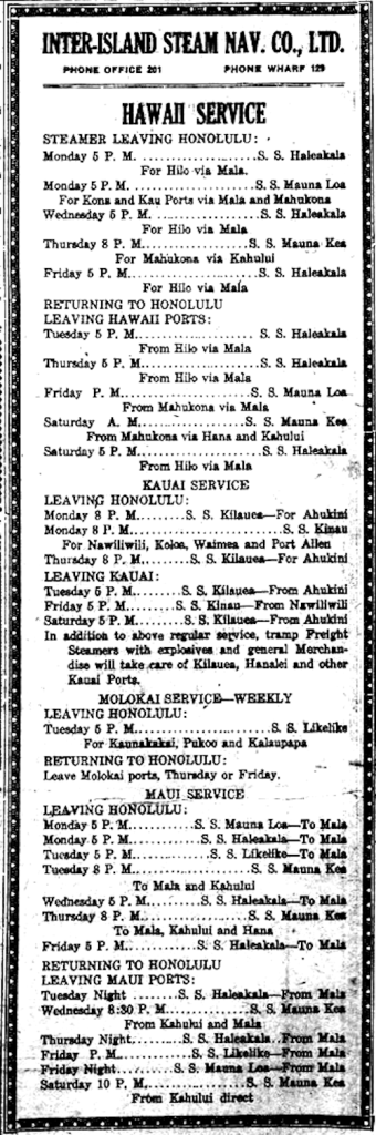 In addition to above regular service, tramp Freight Steamers with explosives and general Merchandise will take care of Kilauea, Hanalei and other Kauai Ports.
