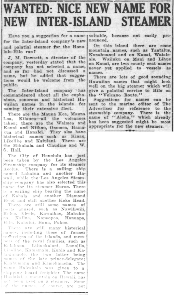 Suggestions for names can be sent to the marine editor of The Advertiser for reference to the steamship company. There is the name of “Aloha,” which already has been suggested might be most appropriate for the new steamer.