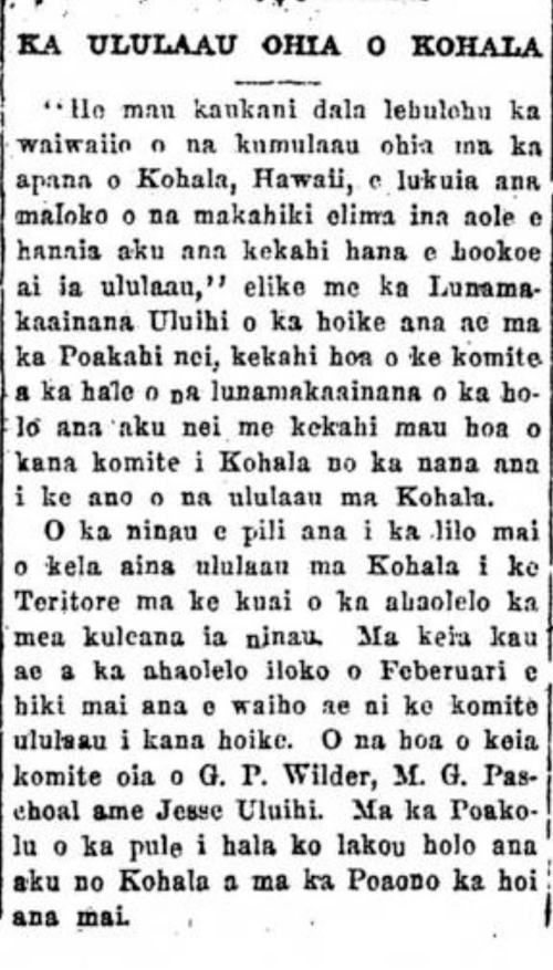 The question pertaining to those forest lands of Kohala going to the Territory by being purchased by the legislature is what brought on this question. In the next session of the legislature in the coming February, the committee on forestry will present its report. The members of this committee are G. P. Wilder, M. G. Paschoal and Jesse Uluihi. On Wednesday last week, they went to Kohala and on Saturday they will return.
