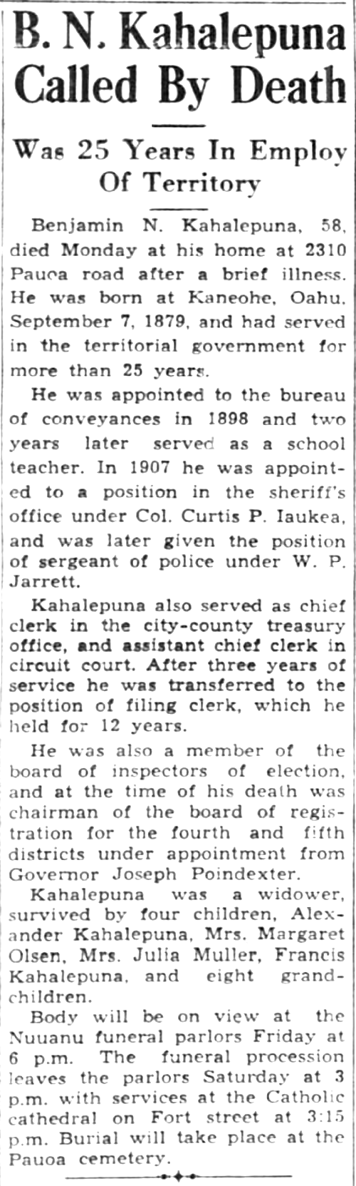 Kahalepuna was a widower, survived by four children, Alexander Kahalepuna, Mrs. Margaret Olsen, Mrs. Julia Muller, Francis Kahalepuna, and eight grandchildren.