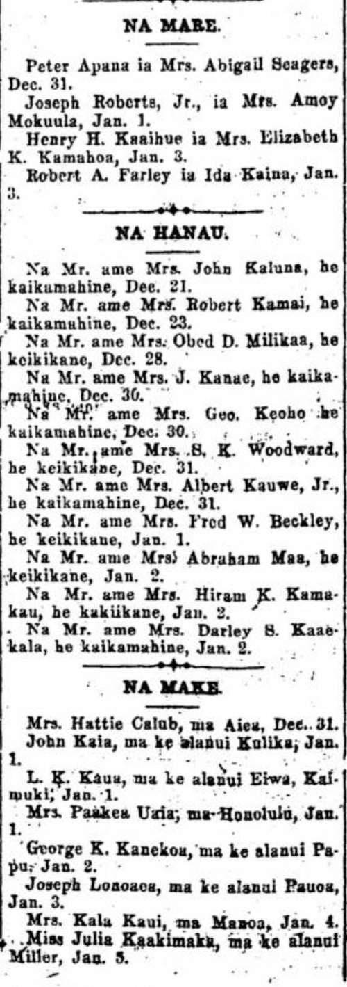 Henry H. Kaaihue to Mrs. Elizabeth K. Kamahoa, Jan. 3.