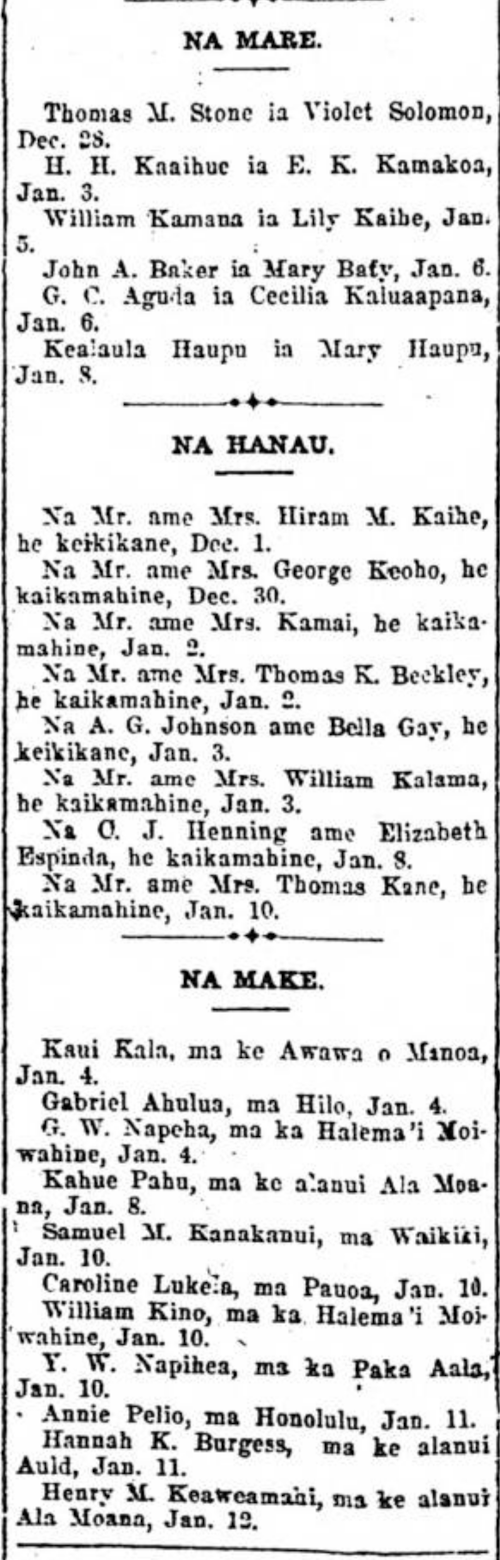 Kealaula Haupu to Mary Haupu, Jan. 8.