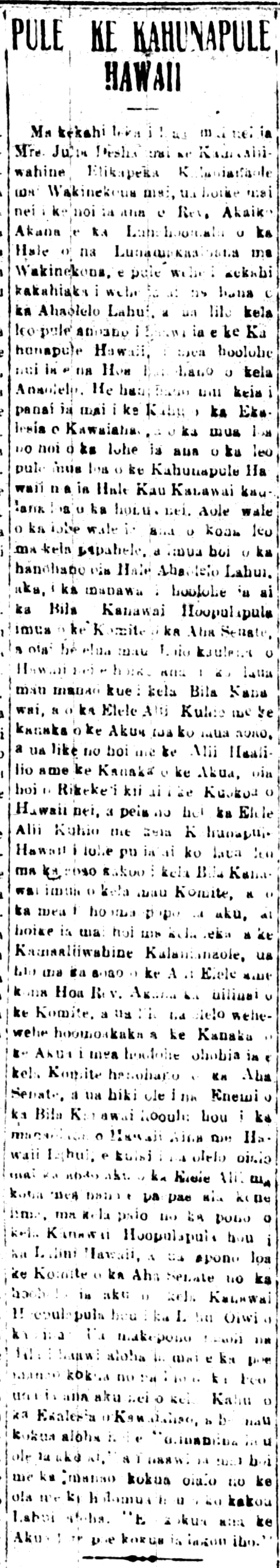 In a letter from Princess Elizabeth Kalanianaole from Washington received by Mrs. Julia Desha reported that the Rev. Akaiko Akana was requested by the Speaker of the House of Representatives in Washington to give the opening prayer on a morning when the proceedings of the House of Representatives were opened, and that solemn voice of prayer given by the Hawaiian Pastor was listened carefully to by the distinguished Members of that Body. This was a great honor given to the Kahu of the Kawaiahao Church, and it was the very first time the first words of prayer given by a Hawaiian Pastor was heard in that world-renown Legislative Building. His voice was not just heard on that floor of that House of Representatives, but when the Rehabilitation Bill was heard before the Committee of the Senate, and when two famous attorneys of Hawaii nei were voicing their objections to the Bill, and the Royal Delegate Kuhio along with the man of God were on the other side; it was like the Alii Haalilio and the Man of God, that being Richards when they were going to acquire Independence for Hawaii nei; and this was like the Royal Delegate Kuhio and that Hawaiian Pastor who voices were heard on the supporting side of that Bill before those Committees, and what was seen, and that was expressed in that letter from Princess Kalanianaole, was that the side of the Royal Delegate and his Friend, the Rev. Akana, gained the trust of the Committee, and the clear explanation of the Man of God was something that was listened to enthusiastically by that honored Committee of the Senate, and the Enemies of the Bill to regenerate the hope of the Aina and Lahui of Hawaii could not topple the true words of the side of the Royal Delegate in what he supported, in fighting for the good of this Bill to Rehabilitate the Hawaiian Lahui, and the Committee of the Senate agreed to pass the Act to Rehabilitate the native Lahui of the land. The money donated by those who wanted to help with the expenses to send that Kahu of the Kawaiahao Church was truly worth it, and it was loving aid that was “not to be regretted,” and given with true feelings of assistance for the well being and the progress of our beloved Lahui. “God helps those who help themselves.”