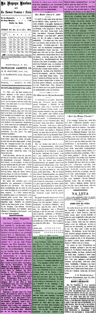 At the hour of 11 in the midday, April 26, at the festooned residence here in Honolulu nei of His Excellency [ka Mea Mahalo ia] Samuel Parker, Minister of Foreign Affairs, joined together by Rev. A. Mackintosh were Charles Maguire and Miss Mary H. Parker, the first born of the Minister, honored by the groomsman and bridesmaid [ku aoao], Palmer Woods and Miss Kamakee Cummins. At the same time and place, by that same pastor, Mr. Robert R. Hind Jr. and Miss Hannah Low were joined together, honored by the groomsman and bridesmaid, William Wright and Miss Hassinger. Amongst those who came to witness this distinguished marriage were the Alii the Queen, His Excellency the Governor A. S. Cleghorn, His Excellency, the Minister and Mrs. S. Parker, the Hon. Major J. W. Robertson, Steward of the Palace, Col. J. Richardson of the personal guards of the Queen and Mrs. Richardson, Hon. and Mrs. W. G. Irwin, Hon. and Mrs. C. O. Berger, Mr. and Mrs. J. Hay Wodehouse Jr., Mr. John Maguire, father of Mr. Charles Maguire, Mrs. J. W. Gay and those very close to the wedded ones.