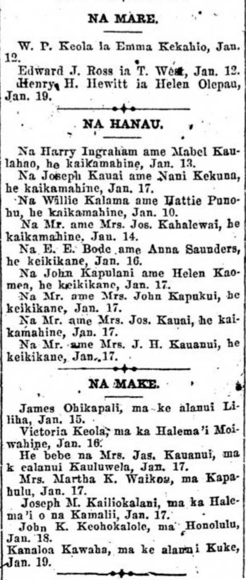 A baby of Mrs. James Kauanui, on Kauluwela Street, Jan. 17.