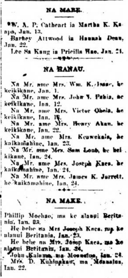 A baby of Mrs. Joseph Kaea, on Bertiania Street, Jan. 24.