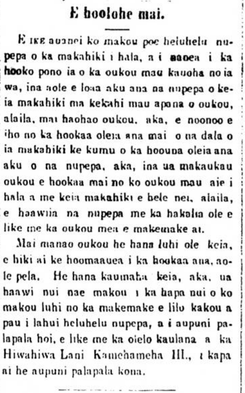 Do not imagine that this is not laborious work that you can disregard paying for, that is not the case. This is a burdensome occupation, but we have put in a majority of our labor because of our desire to make all of us into a lahui of readers of newspapers, and a nation of literacy, just as the famous words of the Precious Heavenly One, Kamehameha III, saying his was a nation of literacy.