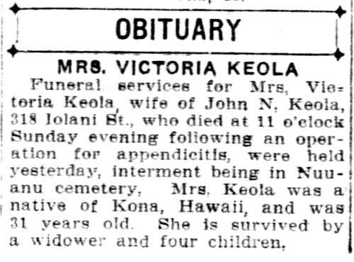 Funeral services for Mrs. Victoria Keola, wife of John N. Keola, 318 Iolani St., who died at 11 o’clock Sunday evening following an operation for appendicitis, were held yesterday, interment being in Nuuanu cemetery. Mrs. Keola was a native of Kona, Hawaii, and was 31 years old. She is survived by a widower and four children.