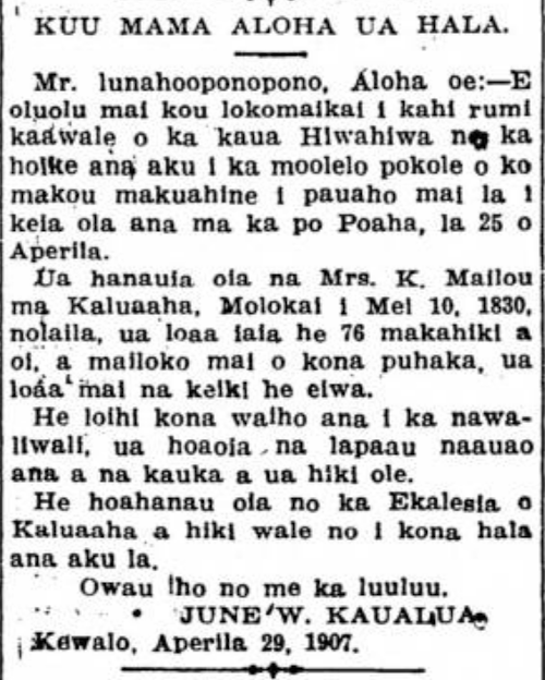 She was given birth by Mrs. K. Mailou at Kaluaaha, Molokai on May 10, 1830; therefore, she was 76 years old or more, and from her loins, she had nine children.
