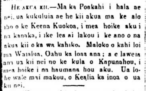 A godly figure.—On this past Monday, a godly figure was stood up at the front of the Kuokoa Office, to show the Hawaiians so that they see clearly the nature of the akua kii of the olden days. It was found in a taro patch in Waialua, Oahu; and the kii was brought to the school of Kapunahou as something to also show the students. We have heard that the name of this kii is Kealia.
