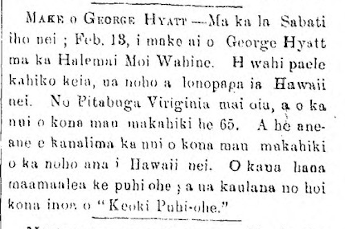 George Hyatt has died—On this past Sunday, Feb. 13, George Hyatt died at the Queen’s Hospital. He was an old black man, and he was well known here in Hawaii. He was from Pittsburgh, Virginia, and he was 65 years old. And the length of his residence in Hawaii nei was almost fifty years. He was skilled at playing wind instruments [puhi ohe]; and he was well known by the name “Keoki Puhi-ohe.”