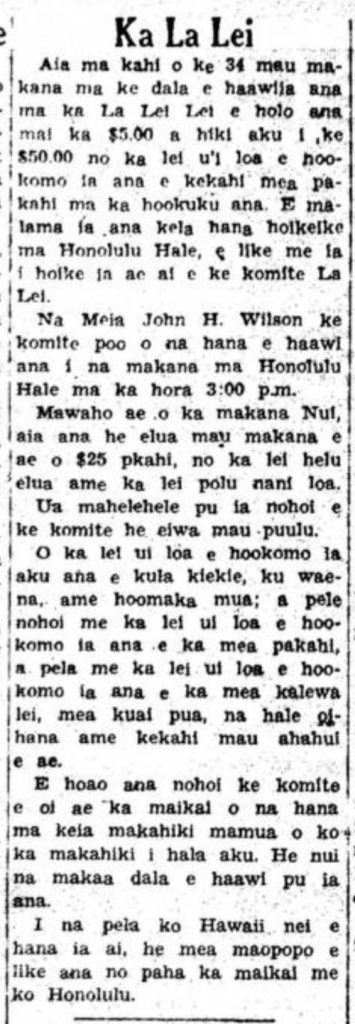There are about 34 cash prizes that will be awarded on Lei Day, running from $5.00 to $50.00 for the most beautiful lei entered by an individual in the contest. The exhibit will be held at Honolulu Hale, as was announced by the Lei Day committee.