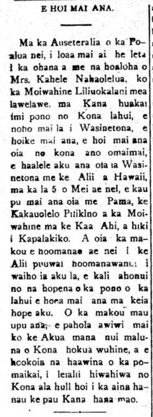 Aboard the Australia of this past Tuesday, there was a letter received by the family and friends of Mrs. Kahele Nahaolelua, Queen Liliuokalani’s lady-in-waiting [mea lawelawe], on Her [the Queen’s] voyage to seek what is right for Her people, who is staying in Washington; saying that she [Nahaolelua] is returning because of her illness, and she will leave Washington and the Alii of Hawaii, on the 5th of May, and will ride the Train with Palmer [Pama], the personal secretary of the Queen, until San Francisco. And with that we think of the Alii of persevering heart who will be left, waiting patiently for the outcome of justice for people which is to come. Our desire is that God’s divine power will quickly spread over Her womanly shoulders and the blessings be fulfilled, as a precious crown for Her return path to Her land of birth, when her work there is through.