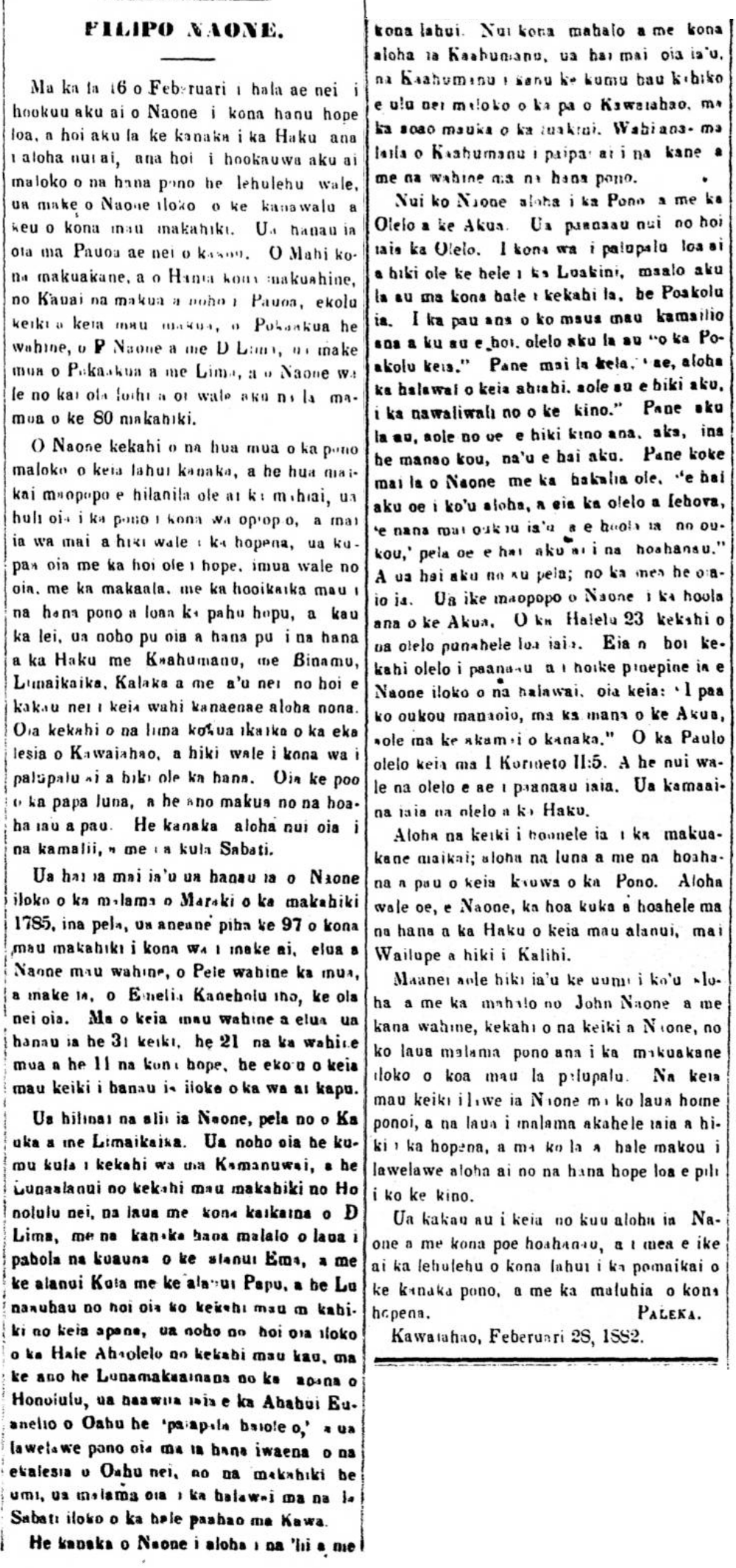 On the 16th of February past, Naone let out his last breath, and the man returned to his Lord whom he loved greatly, for whom he was a servant in many good works; Naone died at eighty or so years old. He was born up in Pauoa. His father was Mahi and his mother was Hama [?? it is hard to read]; his parents were from Kauai and then resided in Pauoa; these parents had three children: Pokaakua, along with P. Naone and D. Lima; Pokaakua and Lima died ealier, and only Naone lived until old age, living for more than 80 years.
