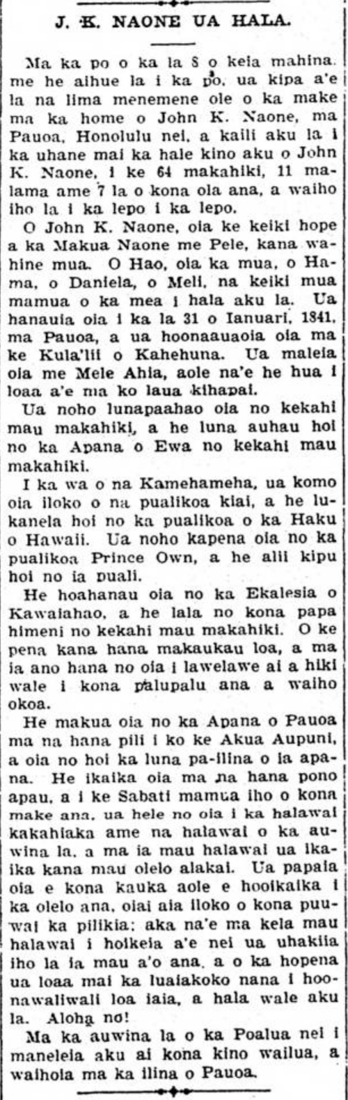On the 8th of this month, like a their in the night, the hand of death which has no compassion visited the home of John K. Naone, at Pauoa, Honolulu nei, and snatched away the spirit of the bodily abode of John K. Naone, at 64 years old 11 months and 7 days of life, and left behind dust to dust.