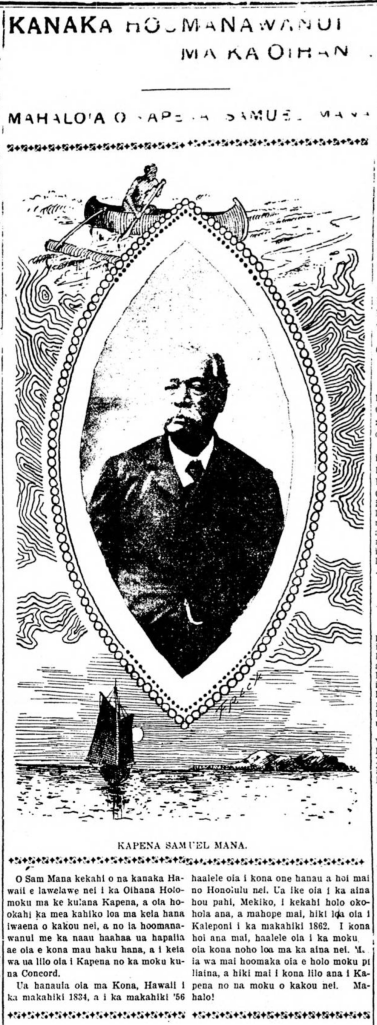 Sam Mana is one of the Hawaiians who is employed in the Sailing Profession as a Captain, and he is the only one among us who has been at it from a very long time ago, and because of his fortitude, he has been promoted by his foremen, and has now become the Captain of the ship the Concord.