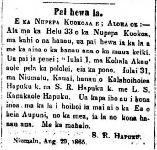 O Kuokoaa [We are all human.] Newspaper; Aloha oe:—In Issue 33 of the Kuokoa, in the births section, the date and place of birth of our child was misprinted. It was printed this way: “July 1, at North Kohala” that is not correct, this is what is right. July 31, at Niumalu, Kauai, born was Kalahoihoiea Hapuku (m). by S. R. Hapukuu (m) and L. S. Kanakaole Hapuku. I named him for the day the Sovereignty of the Nation was restored, for that was the day on which he was born. With thanks.
