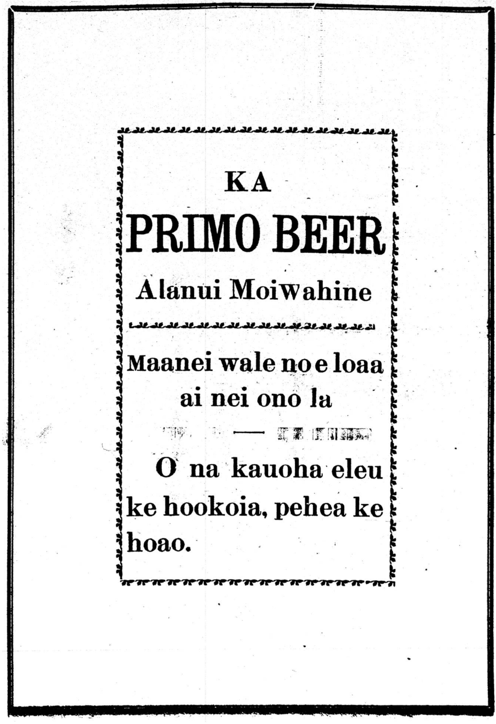 Early Primo Beer ad from 110 years ago, 1911. Posted on May 18, 2021 by nupepa Reply PRIMO BEER Queen Street You can only get this deliciousness here Orders will be filled quickly; why don’t you try it. (Au Hou, 1/4/1911, p. 3) Ke Au Hou, Buke 2, Helu 1, Aoao 3. Ianuari 4, 1911.