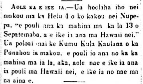 It will not be seen after all.—We reported in Issue 4 of our Newspaper, “the moon will be eclipsed o n the 13th of September, and it will be seen here in Hawaii.” The Famous School Teacher of Punahou proclaimed to us that the moon will indeed be eclipsed on that day, but the eclipse will not be visible here in Hawaii; it will be seen in other lands.