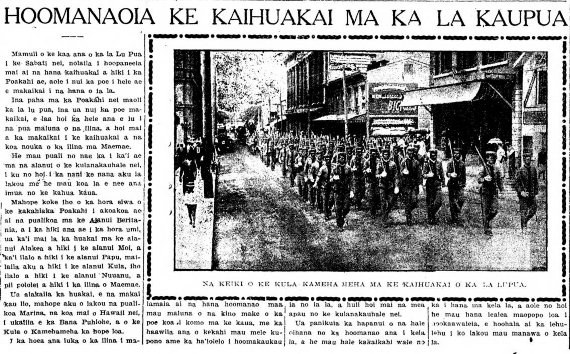 Right after nine o’clock on Monday morning, the armed forces gathered on Beritania Street, and at ten o’clock, the parade marched on Alakea Street until King Street, and marched down Fort Street, and from there until School Street, went down until Nuuanu Street, and went straight up until the cemetery of Maemae.