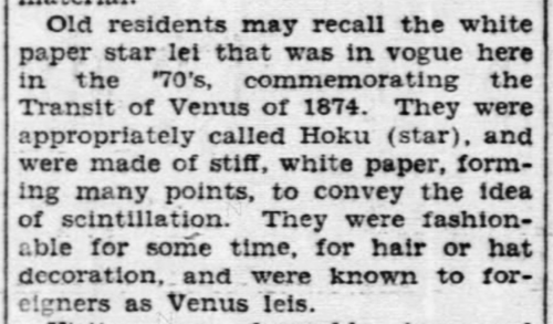 Old residents may recall the white paper star lei that was in vogue here in the ’70s, commemorating the Transit of Venus of 1874. They were appropriately called Hoku (star), and were made of stiff, white paper, forming many points, to convey the idea of scintillation. They were fashionable for some time, for hair or hat decoration, and were known to foreigners as Venus leis. [Excerpt from “Lei Still Play Important Part in Life of Hawaii as They Have from Antiquity” by Albert Pierce Taylor.]