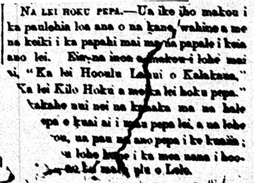 Paper Star Lei.—We have seen men, women, and children greatly engrossed in decorating their hats with this kind of lei. These are the names we have heard, “the hooulu lahui lei of Kalakaua,” “the Astronomer lei,” and “paper star lei.” [The rest of this article is difficult to read because it seems a piece of tape covers over some of it.]